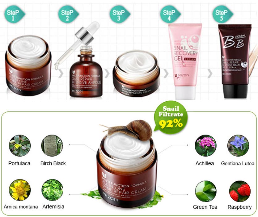 Produk pertama contohnya, MIZON All in One Snail Repair Cream, 92 % Snail Filtrate Extract, menghilangkan jerawat, kulit kusam dan sensitive, kulit yang iritasi, pori pori wajah yang membesar, membuat kekenyalan pada kulit wajah, dan mencerahkan kulit yang warnanya tidak merata.